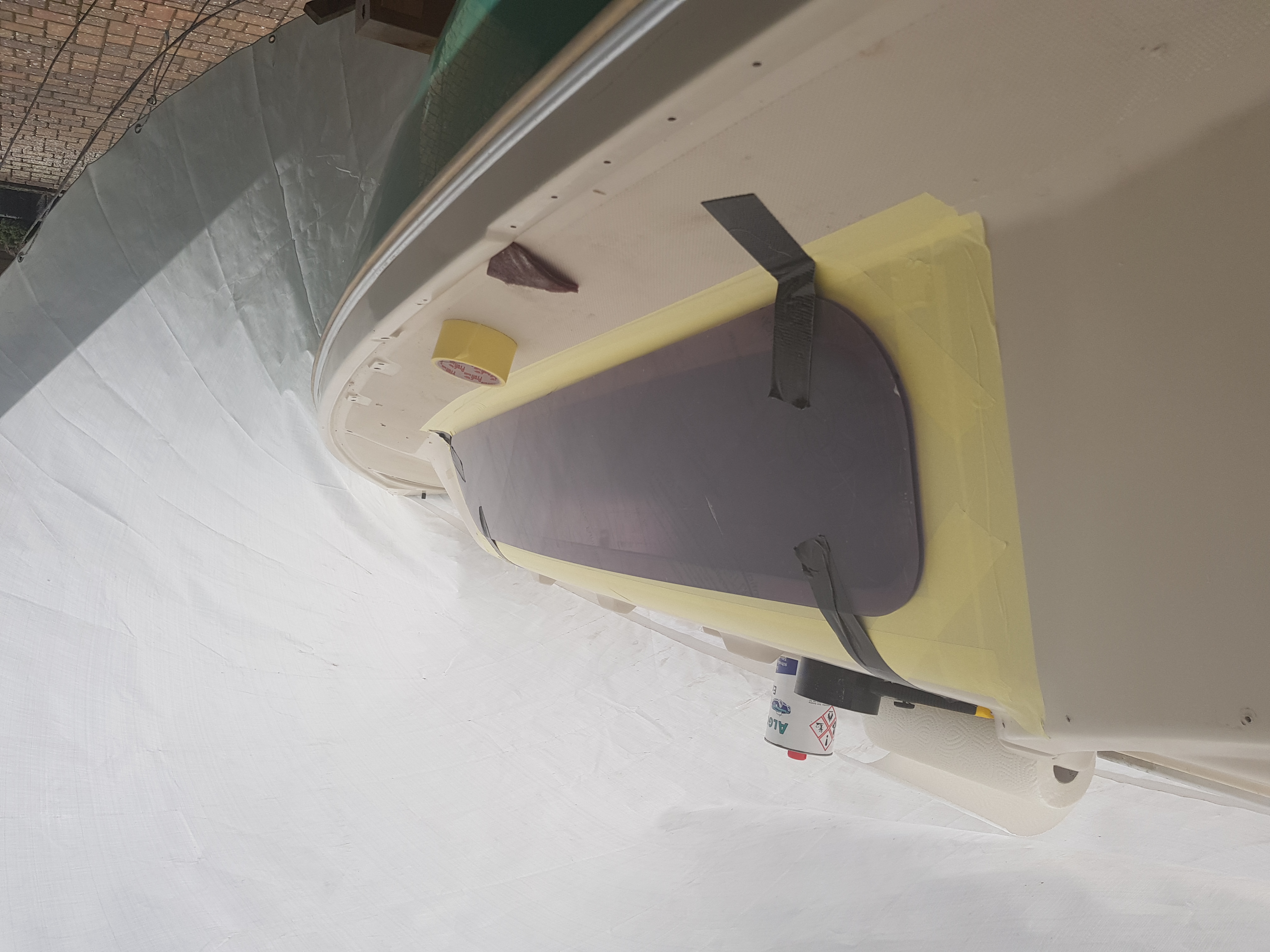 Die Dichtung habe ich dann auf das Fenster geklebt, und das Ganze dann trocken auf den Rumpf gesetzt und verschraubt (Schrauben waren ohnehin schon drin vom Vorbesitzer).