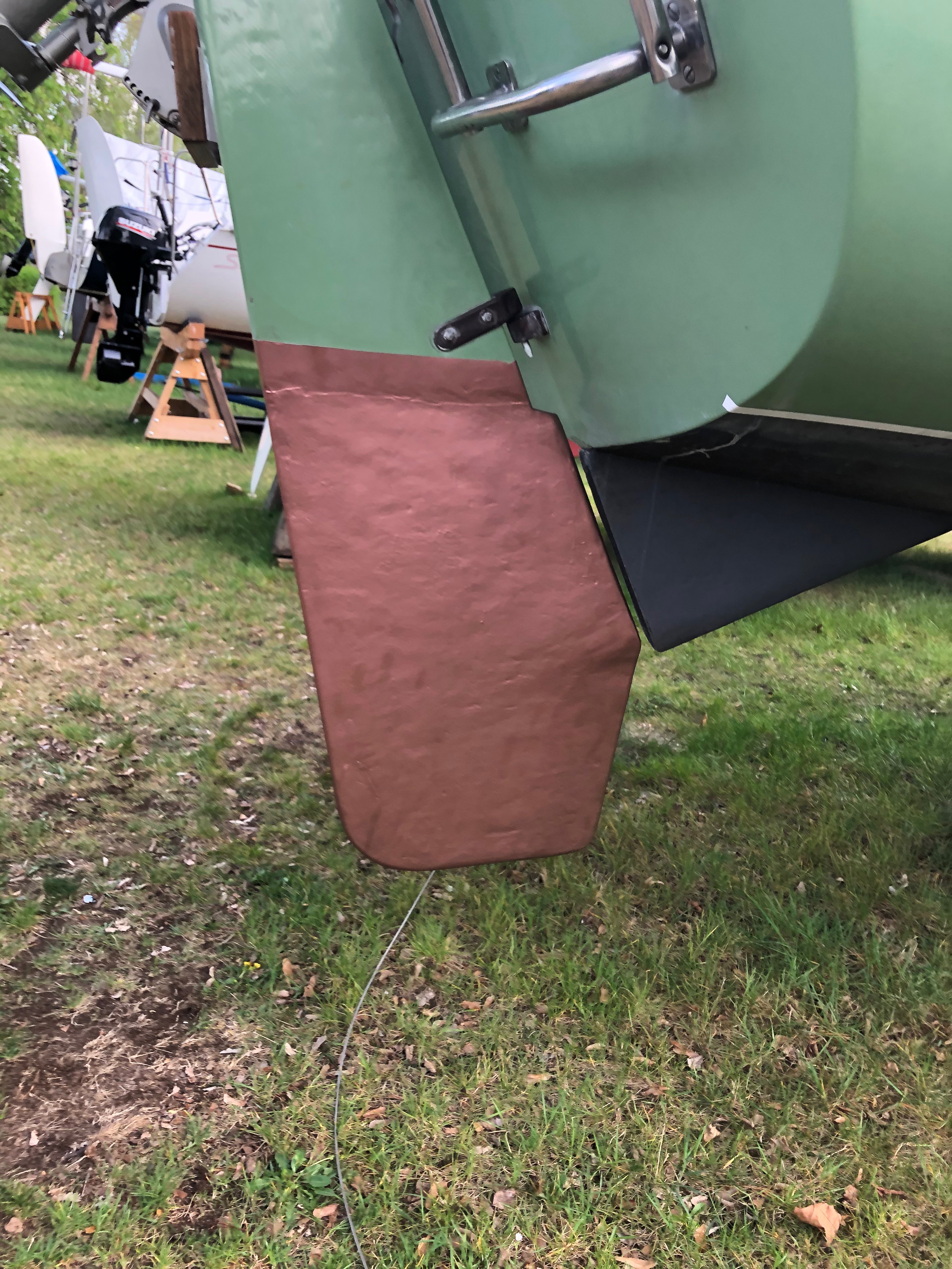 Ich musste Grundierung und Antifouling etwas höher in Richtung Ruderkopf ziehen, weil auch dort Osmose war und das Gelcoat runter musste. Naja, mal schauen, wie lange ich mit einem hübschen Kupferstreifen rumfahre