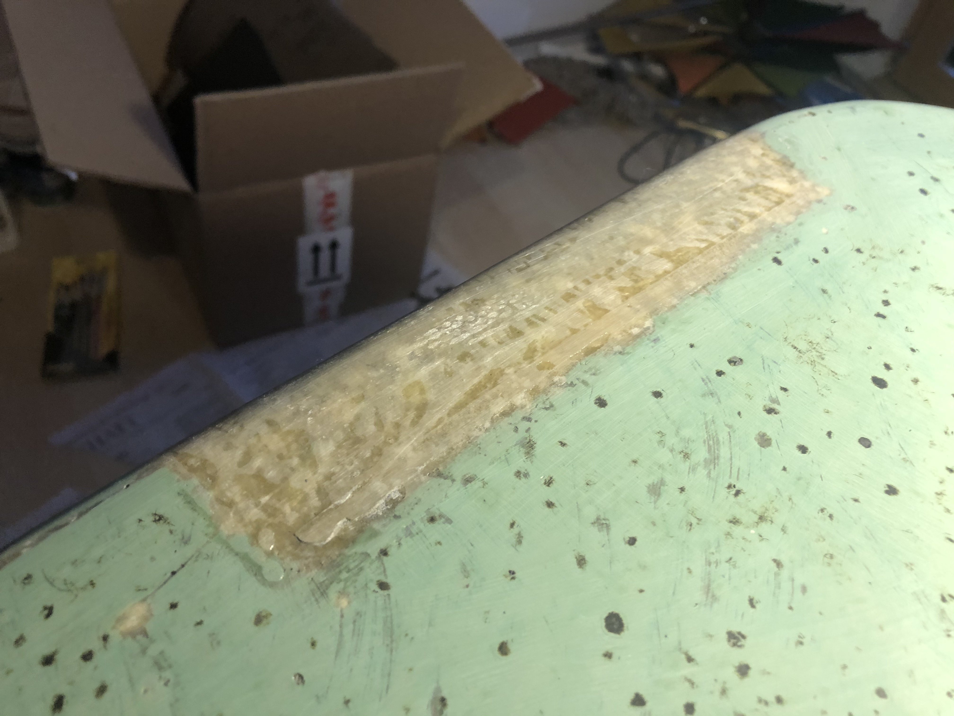 Nach dem Öffnen der Blasen und Ausfräsen derselbigen (leider kein Foto) habe ich mit Watertite gespachtelt. Da ging schon ordentlich Material weg!