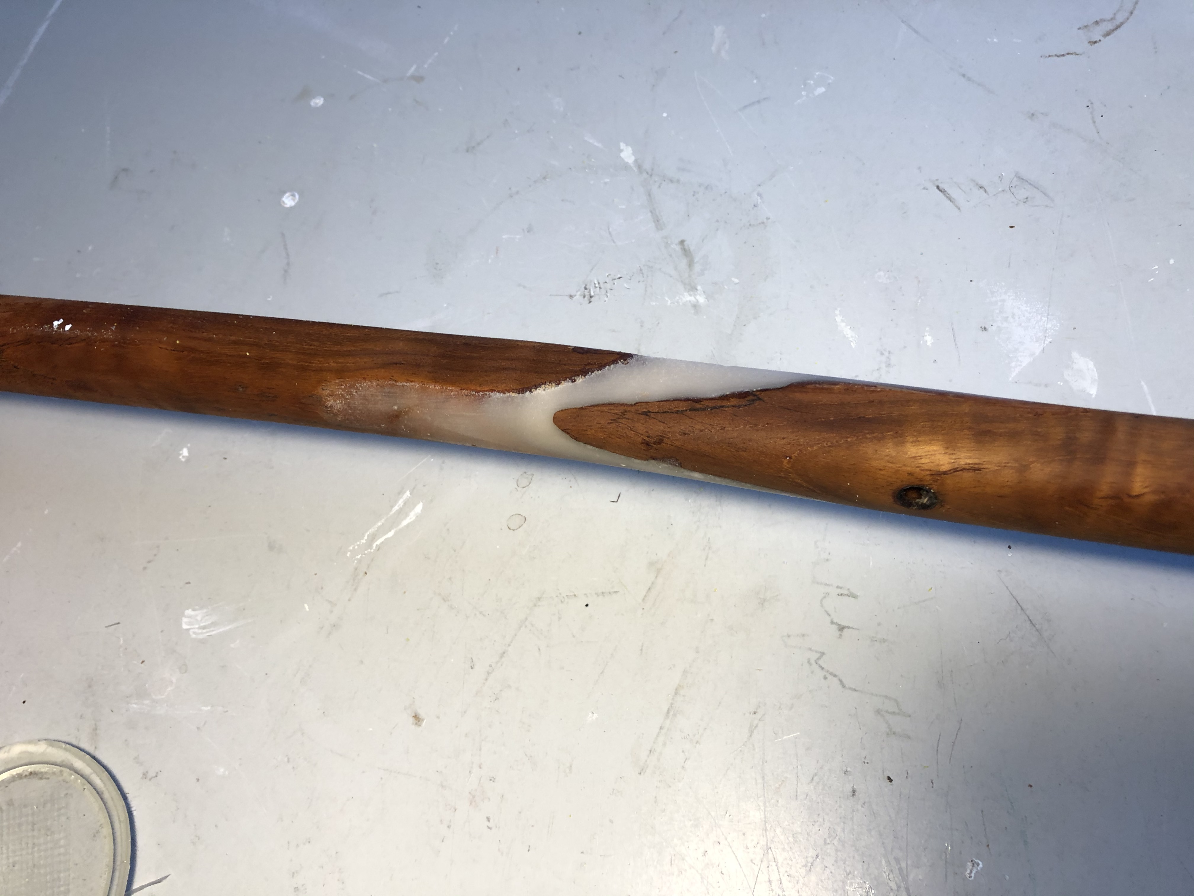 Weil das natürlich nicht gehalten hat, wurde dann einfach ein Stück Seil "drumherumgeflochten". Nun möchte ich das wieder richtig machen, aber das Problem ist, dass die Bruchstelle mit Kleber voll ist und die beiden Seiten nicht mehr sauber ineinander passen. Das würde ich benötigen, um eine saubere, dünne Leim/Klebeschicht aufbringen zu können.
