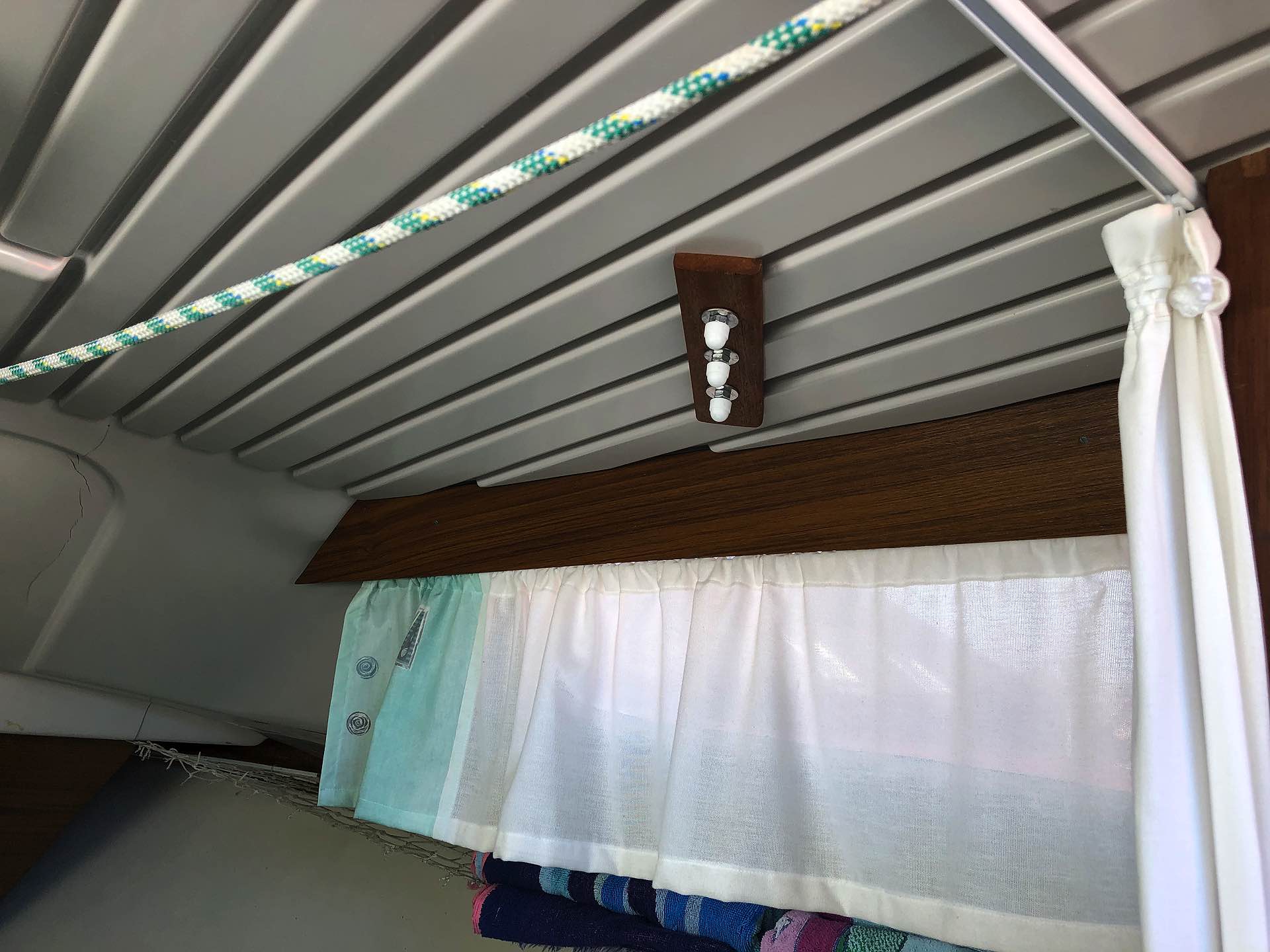 ich habe die Fallen ebenfalls seit dieser Saison umgelenkt. Zur Befestigung habe ich für die Innenseite jeweils eine Gegenplatte gerichtet. In die Rillen, welche zur Aussteifung der Deckeninnenschale dienen, habe ich genau in der Winkelung zugeschnittene Leisten verwendet. Diese schützen die Innenschale gegen Druck durch diese Gegenplatte an der Außenschale ab. Ausschneiden war also nicht erforderlich. Es wäre ja auch schade eine unbeschädigte Innenschale zu zerschneiden ... Dann habe ich die ganze Konstruktion einfach von außen durch geschraubt. Als Material habe ich solche Kunstoffplatten verwendet, wie sie z.B. für Wc Zwischenwände, Duschkabinen in Campingplätzen, Prallwänden usw. verwendet werden. Die sind extrem hart und wartungsfrei. Ich habe sie mir in einer Schreinerei aus der Restekiste besorgen können. Es gab sie da in 8 mm und 10 mm Stärke. Mit diesen Platten habe ich auch den Unterbau der Beschläge auf der Außenseite gemacht. Muss man nicht streichen und sieht akzeptabel aus. Die nötige Höhe, um die Fallen an der Decksschale reibungsfrei laufen lassen zu können, habe ich erreicht in dem ich 3 Platten mit 10 mm Stärke übereinander gelegt habe.