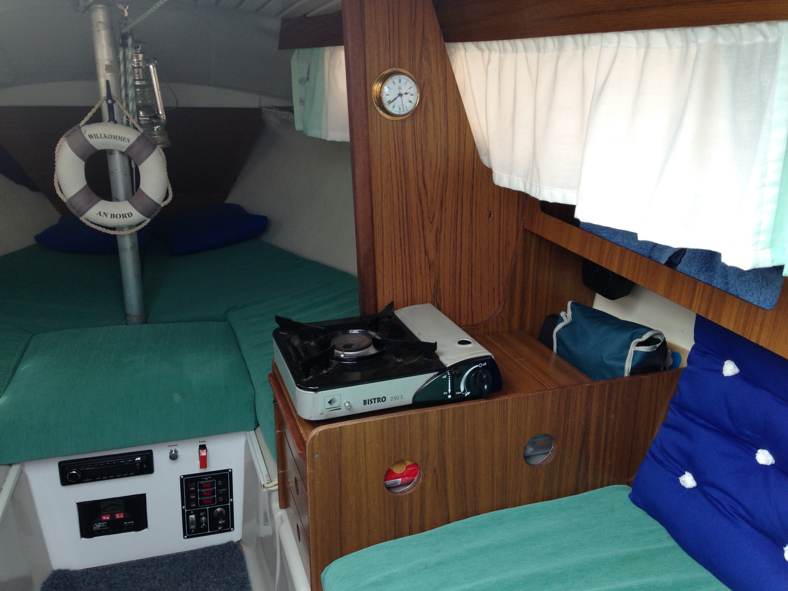 Den hab ich auf der Holz-Abdeckplatte auf dem Steuerbordschränkchen befestigt und nutze den gewonnenen Platz darunter, wo der alte Spirituskocher stand, als Vorratskammer, da sind 5Minuten-Terrinen, Instantkaffee, Teebeutel, Konservendosen mit Ravioli und ein paar trockene Kekse verstaut.