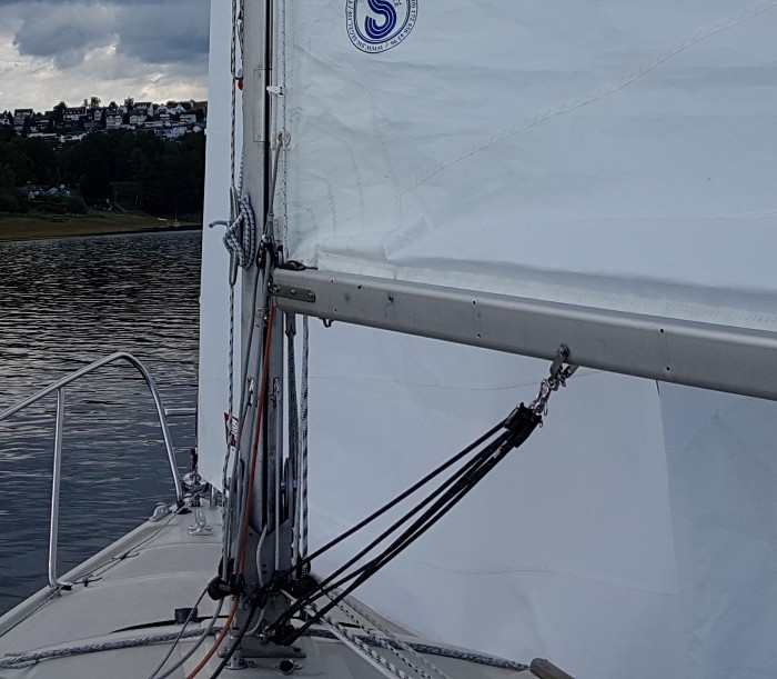 So habe ich eine einfache Untersetzung und kann mit einer Hand das Vorliek trimmen.