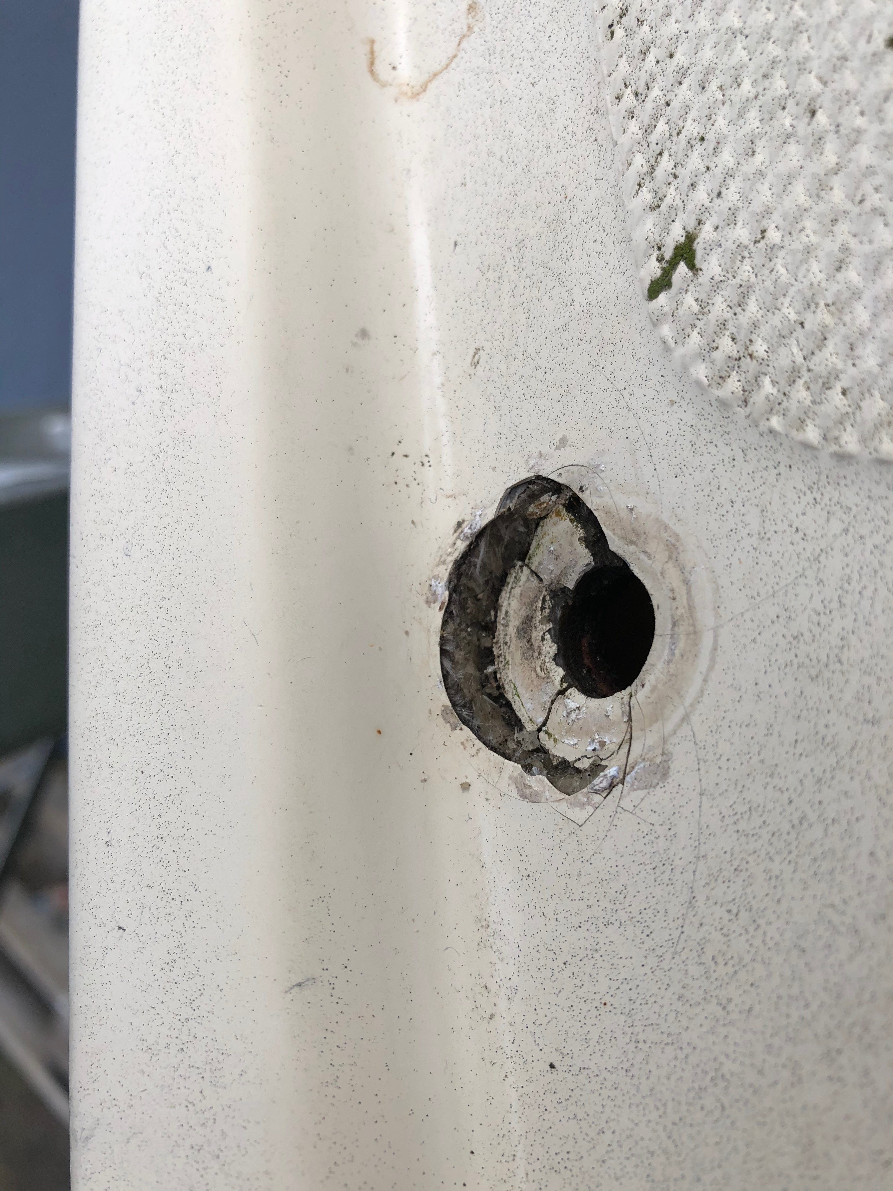 Ob konkret bei diesem Fußpunkt Nässe eingedrungen ist, weiß ich nicht. Als ich aber die Schrauben der beiden heckwärtigen Fußpunkten gelöst habe, kam mir Tropfwasser entgegen. Also ja, ich muss davon ausgehen, dass überall Nässe eingedrungen ist. (Woanders schrieb ich ja auch schon, dass ich die von Dehler vorgesehene Dichtung mit diesen Dubo Profilscheiben aus Plastik für unglücklich halte. Man kann die dafür notwendigen Vorspannkräfte garnicht aufbringen ohne das Gelcoat zu zerstören. Aber das ist ein anderes Thema)