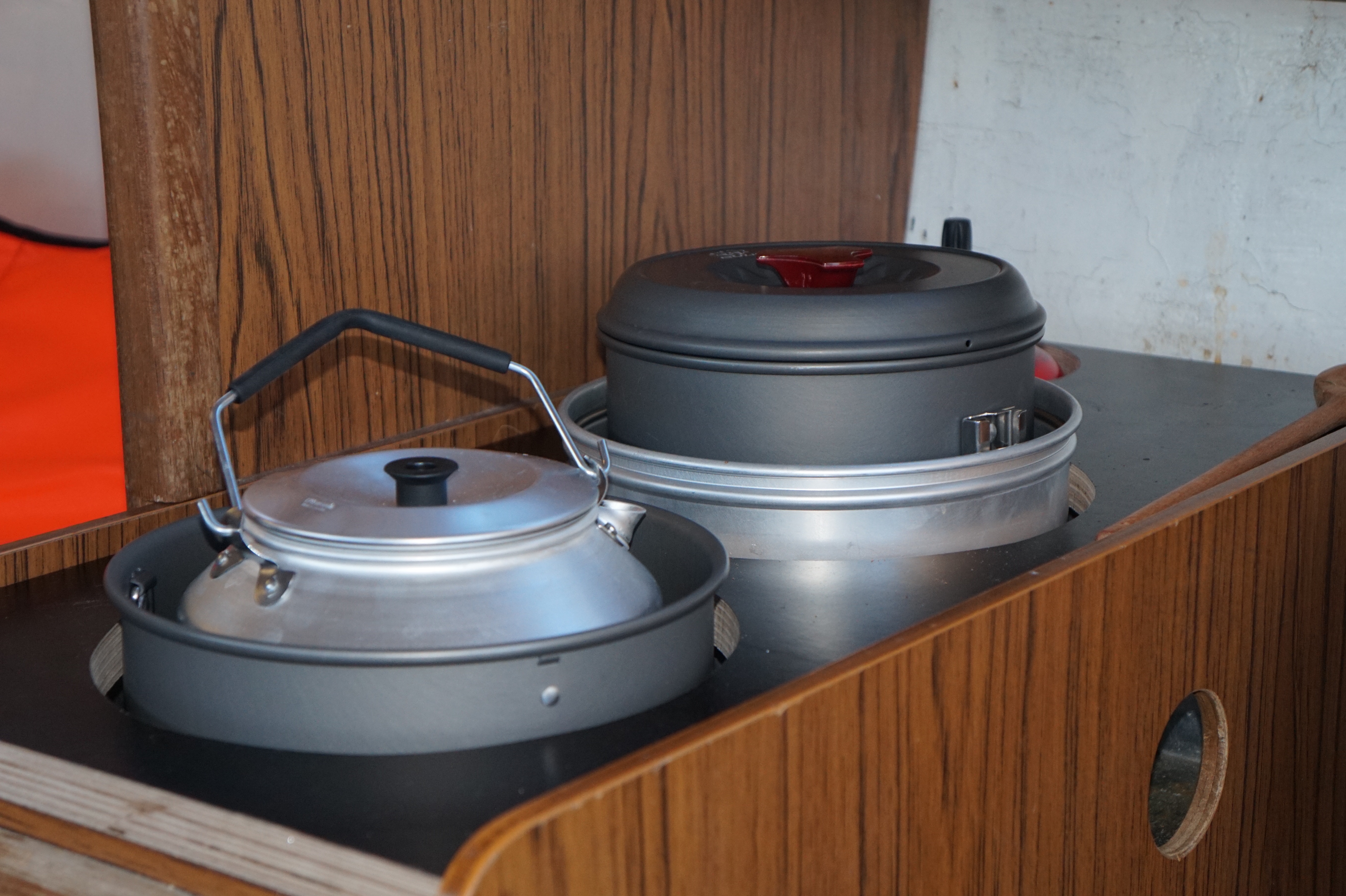 Hab gestern mal die Sturmkocher Trangia (80 euro) und Bulin (34 euro) eingebaut, passt und ist sehr praktisch. Links ist Spiritus (Bulin) , rechts ist Trangia mit Gas. Primus Gaskartusche jederzeit abschraubbar. Die Sturmkocher sind leicht rauszunehmen, da nur mit Zip Ties befestigt. Die Töpfe liegen schön tief in der Mulde, eine Teflon Pfanne ist auch noch da, für Spiegeleier oder Fleisch Bild
