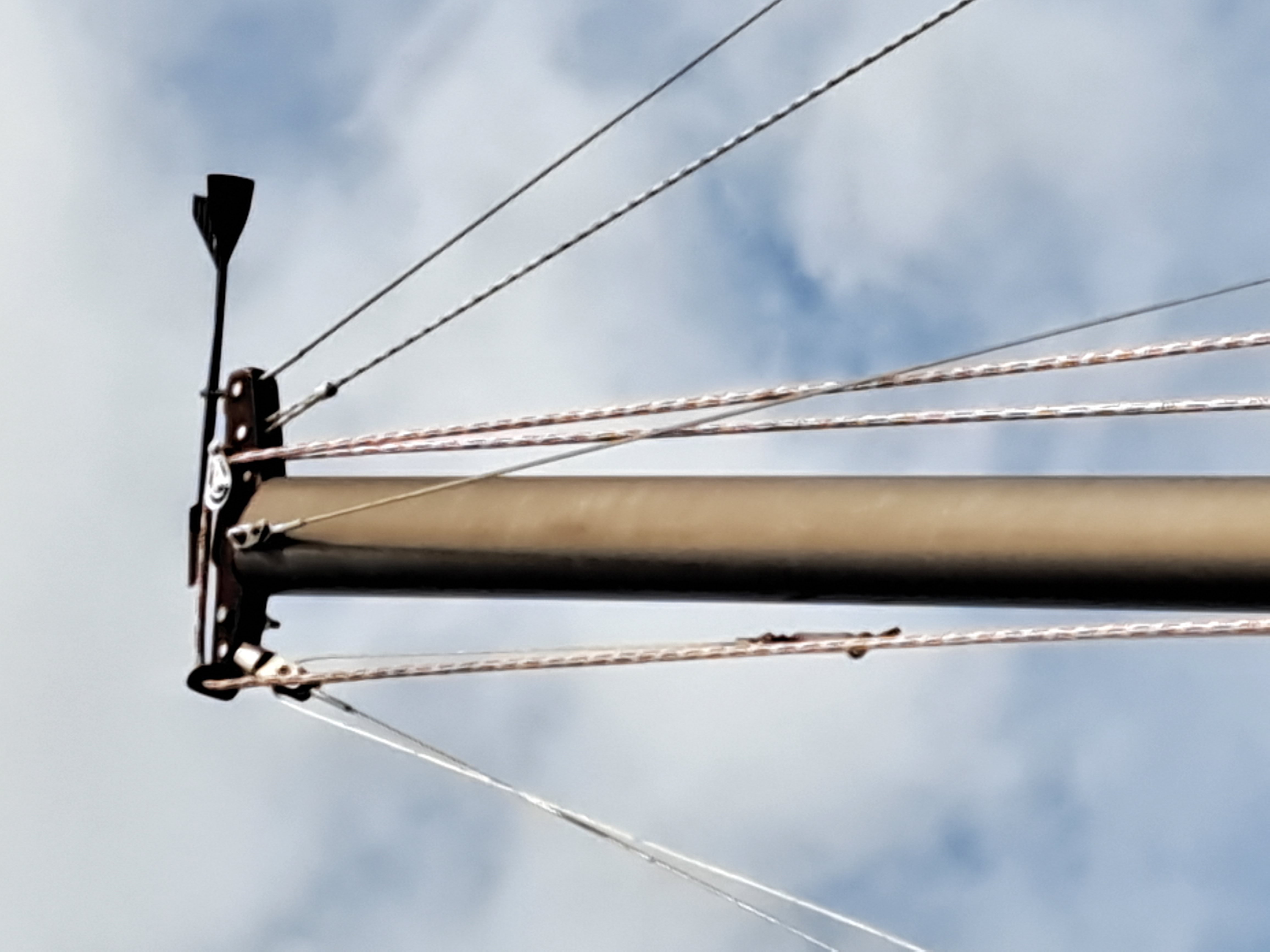 @Thomas: Der Vorstagspanner sollte besser eingestellt werden. Beide Gewinde, das der oberen und der unteren Gabel MÜSSEN gleich lang eingedreht sein. Bei dir ist das obere nur wenige Gewindegänge eingedreht, es könnte sich herausdrehen. Zumal du die Muttern nicht angezogen hast. Gerade bei einer Rollfock ist das brandgefährlich. Der Mast kann herunterkommen.