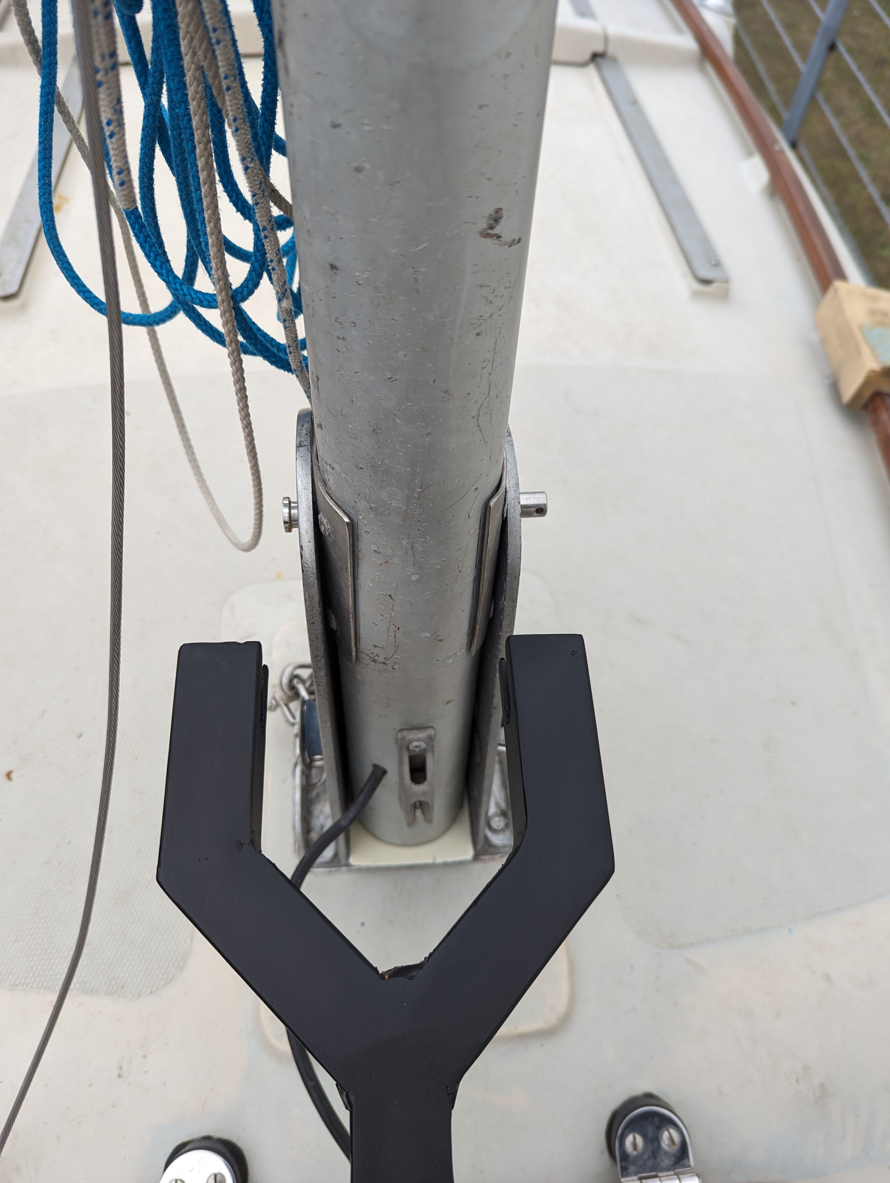 Hier noch Bilder meiner seit Jahren bewährten Mastlegevorrichtung mit Totem Mann (massive Edelstahlstange) und Beschlag im Mast.