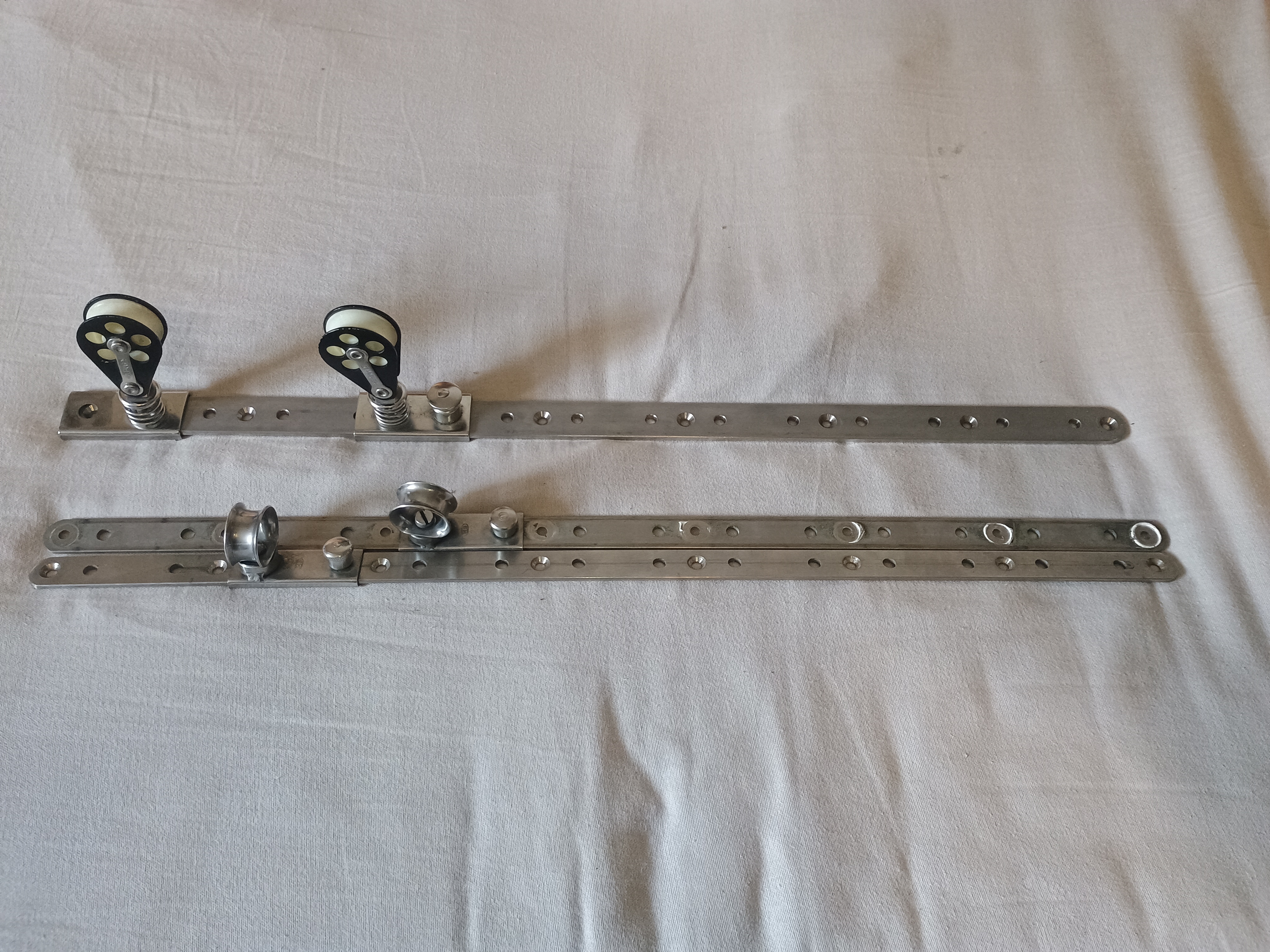 Tausche gerade meine alte Genuaschiene 20x3 gegen eine neue Schiene 25x4 aus... siehe Fotos. Wenn alles funktioniert könnte ich meine alte Genuaschiene verkaufen. Die neue Schiene hat 2 Rollen. Die eine Rolle ist fest verschraubt und die zweite Rolle verschiebbar. Die Rollen sind für 10-12 mm Leinen geeignet.