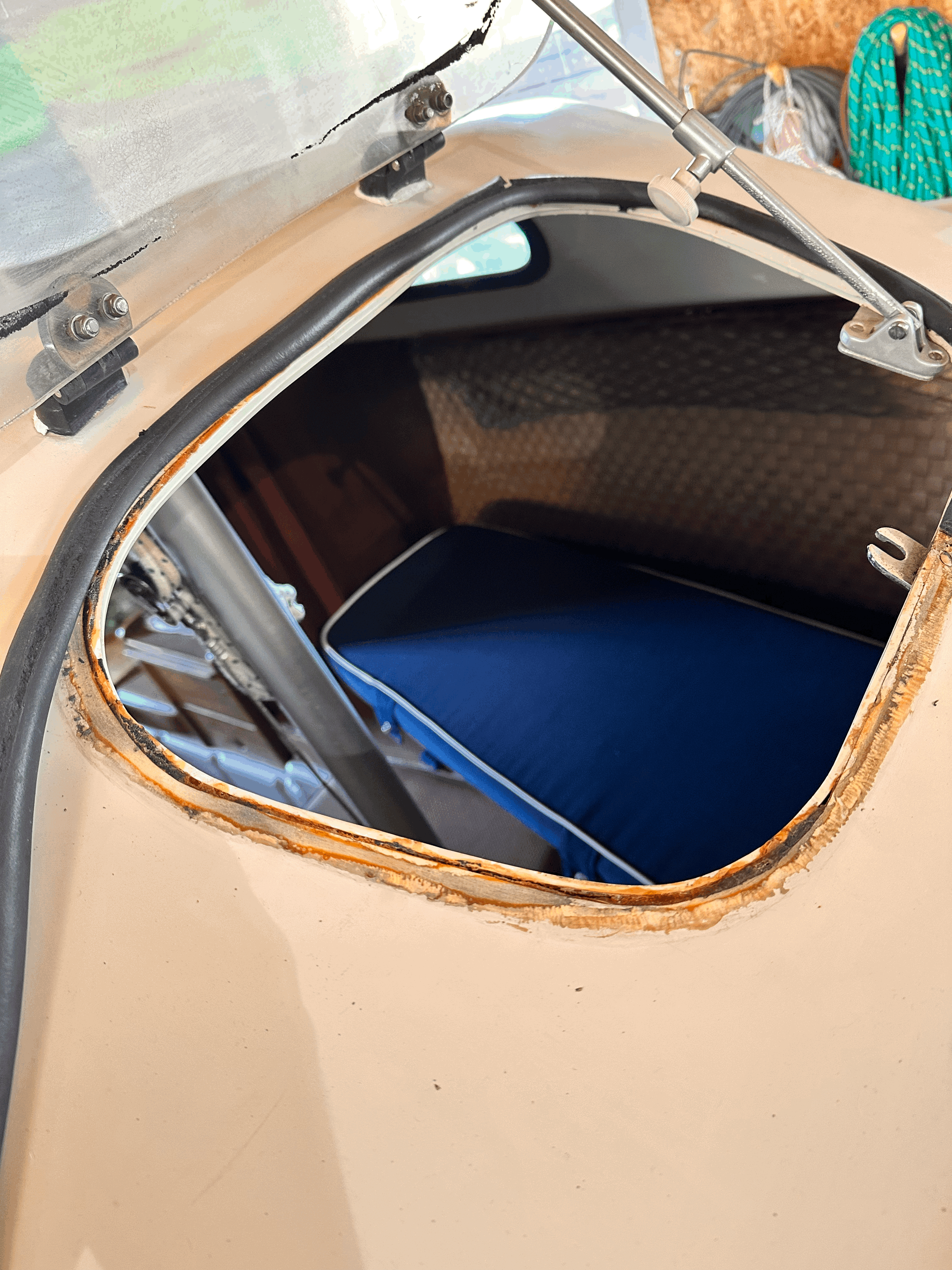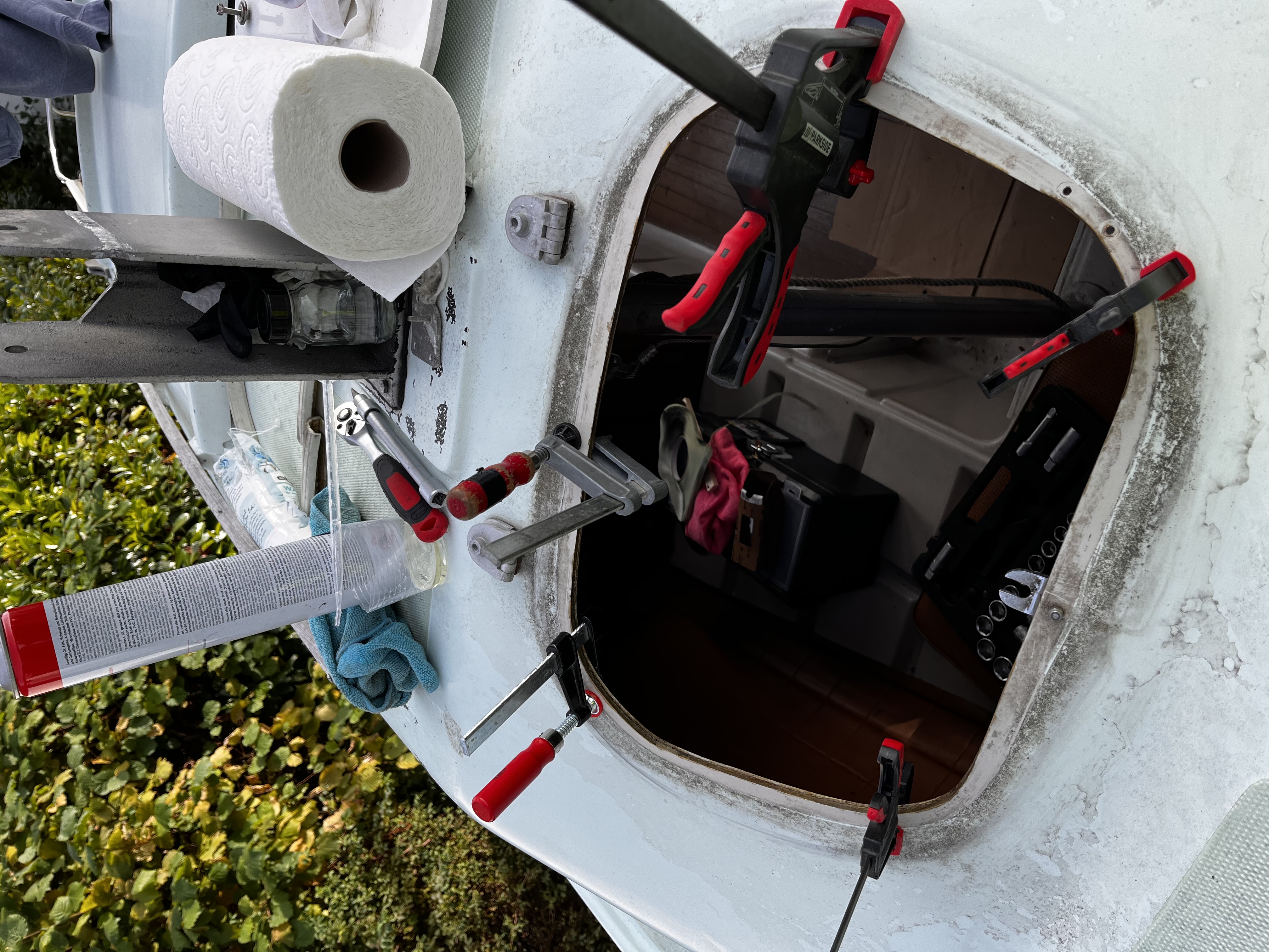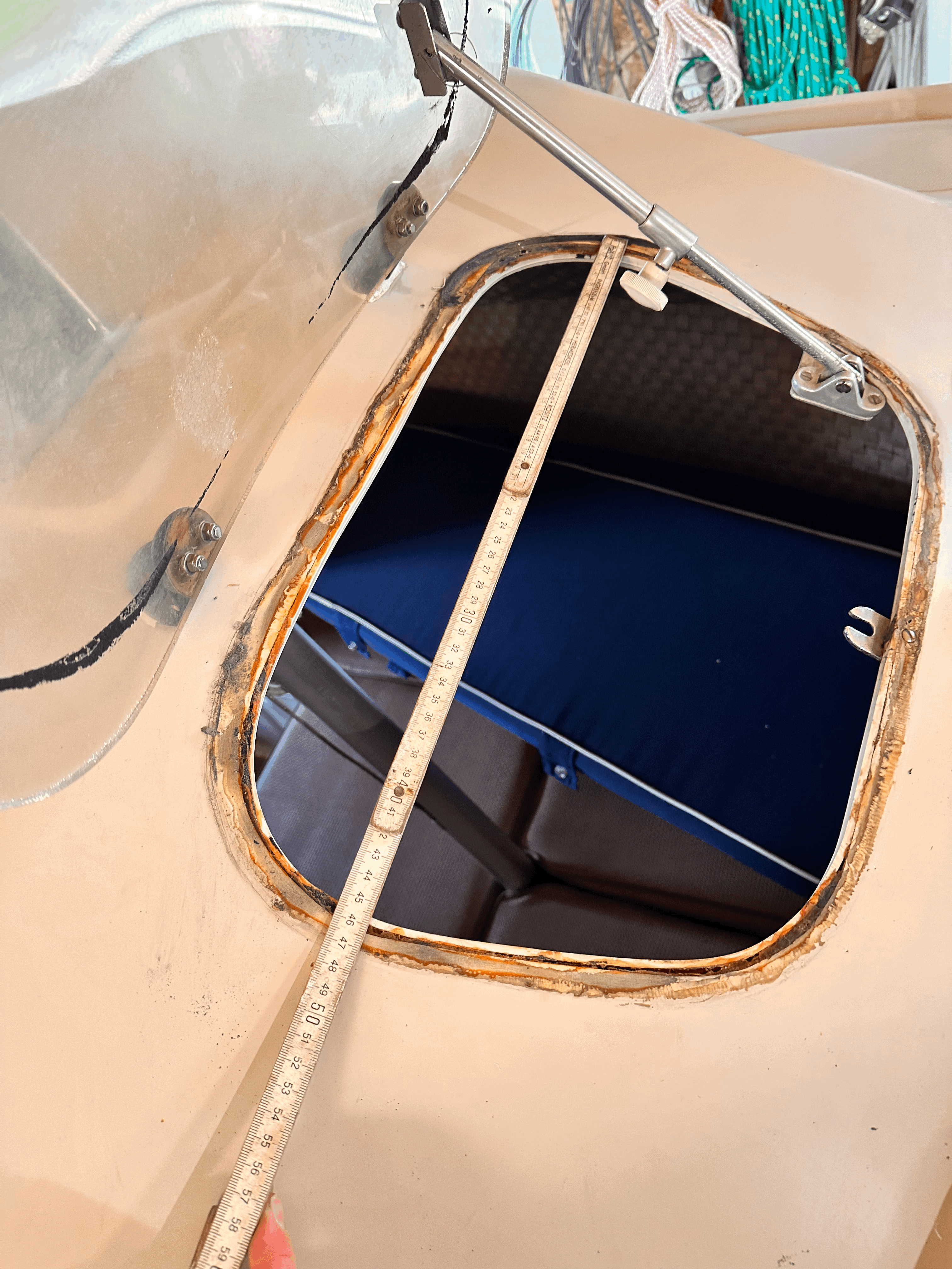 Ich habe heute mal die Dichtung meiner Bugluke abgenommen, da ich sie erneuern will. Darunter sieht es so aus, sie Bild.