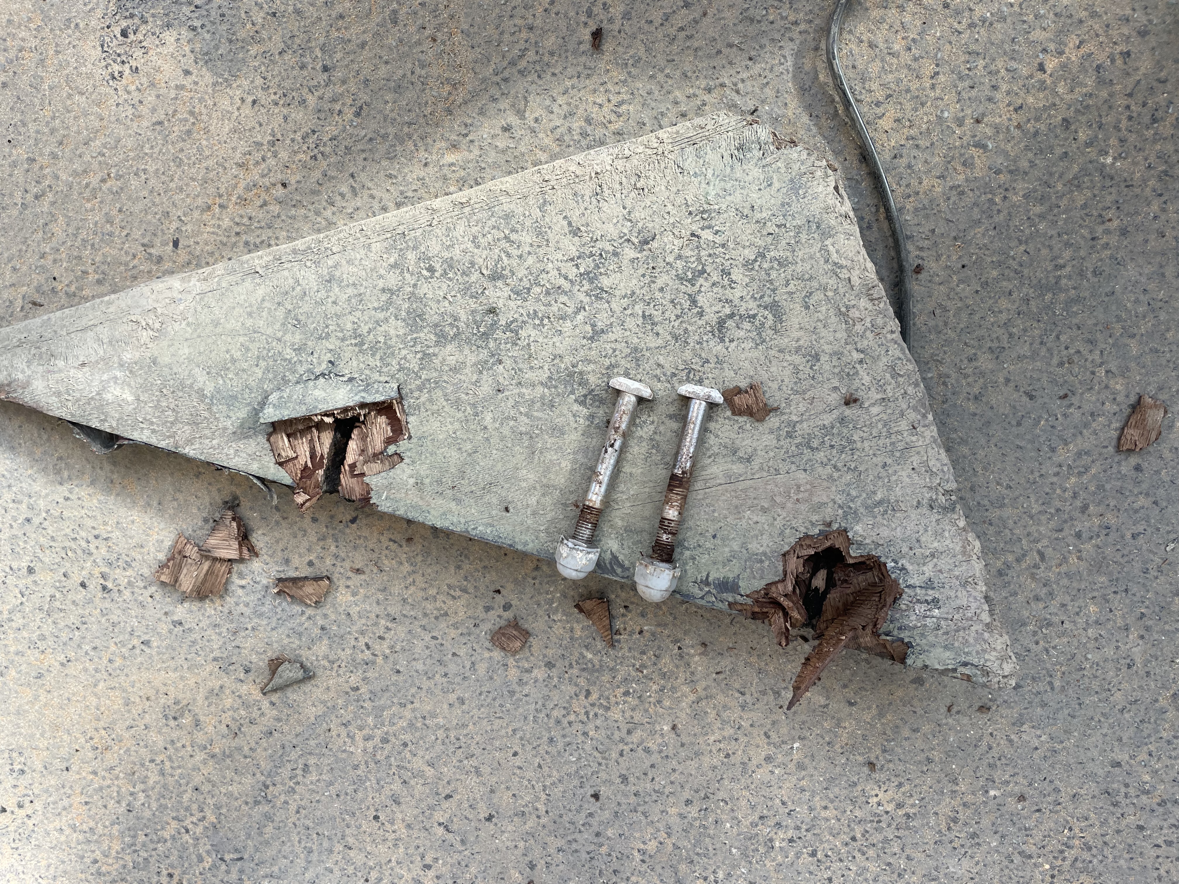 Nein, so wie es aussieht, war das Boot (zumindest an der Stelle 😁) dicht. Abgedichtet war es mit einer flexiblen Masse (für Butylband war es mir aber fast zu „formstabil“), die hat aber noch gehalten. Ich vermute, dass möglicherweise von oben Wasser an den Bolzen entlang in das Holz gewandert ist. So ganz ist das aber nicht mehr nachzuvollziehen, das Ding war an allen Ecken und Kanten angemackt und daher überall mehr oder weniger wassergeschädigt.