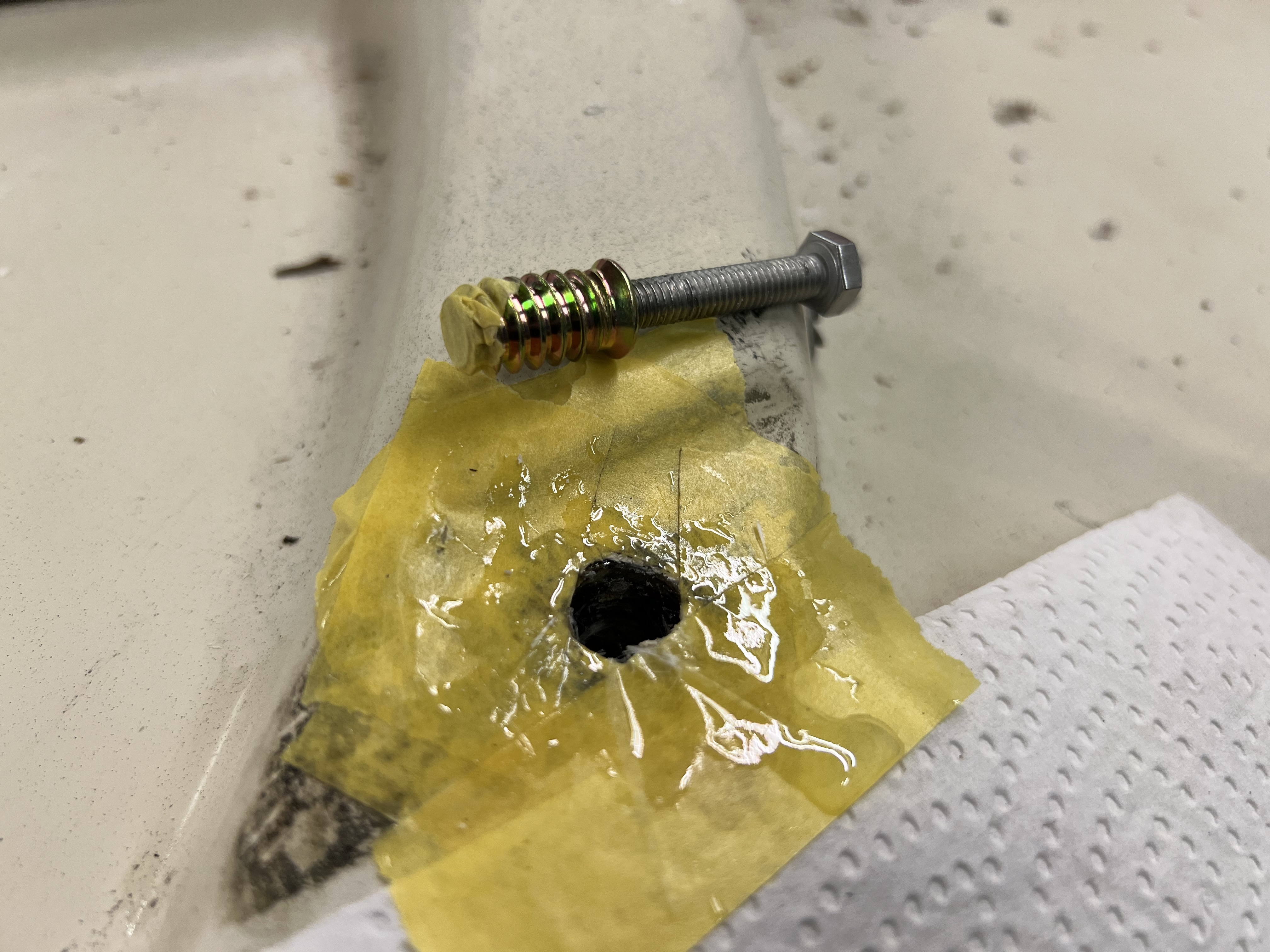 3. Mit Epoxy verfüllen in 2 Schritten. Da nun die Löcher keinen Boden mehr haben, fliesst Epoxy dünnflüssiges Epoxy irgendwohin nach unten in die Kabinenverschalung oder sonstwo hin. Also ca. 10x10 cm große Glasfasermatten mit Expoxy getränkt in die Löcher gestopft, dann etwas mit Füllstoffen verdickten Epoxy hinterher. Das ist etwas grobschlächtig, aber hat geklappt. Es hilft, den Epoxy in eine Spritze aufzuziehen, damit man ihn besser in den Löchern verteilen kann.