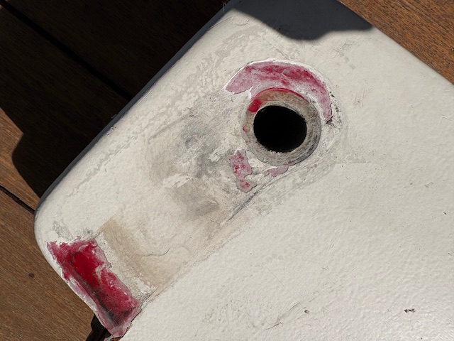 Folgende Situation: Ich habe das Boot seit Ende letzten Sommers und daher noch nicht viel damit unternommen. Beim Auskranen und hochdruckreinigen hatte ich schon gesehen, dass am Ruderblatt an einigen Stellen das Antifouling samt der Schicht darunter (keine Ahnung ob das noch Gelcoat ist) abgeht und das Laminat zum Vorschein kommt (das Rote ist doch das Laminat, oder?). Leider waren dann auch ein paar Erhebungen sichtbar, aus denen beim Einstechen Flüssigkeit austrat. Daher gehe ich davon aus, dass da auch Osmose im Spiel ist. Das ganze sieht so aus: