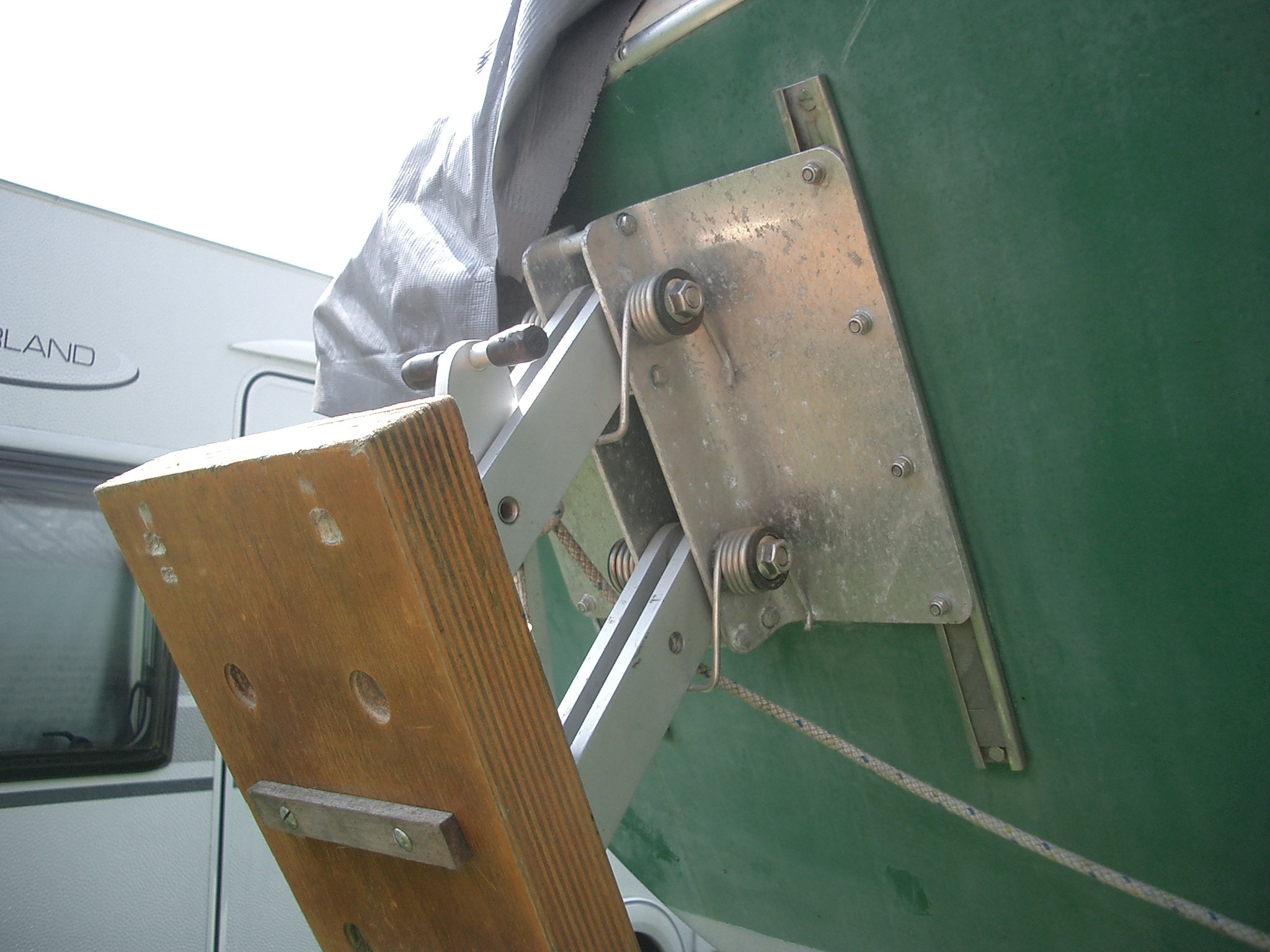Leider ist mein aktueller 6PS AB etwas wuchtiger als der alte (3,5PS) und ließ sich nicht mehr ganz abkippen - die Reling, bzw. das Süll war im Weg. So habe ich noch eine Abstandshalter-Platte (das helle Ding zwischen Halterung und Holzplatte) zusätzlich eingesetzt. Jetzt geht es gerade so.