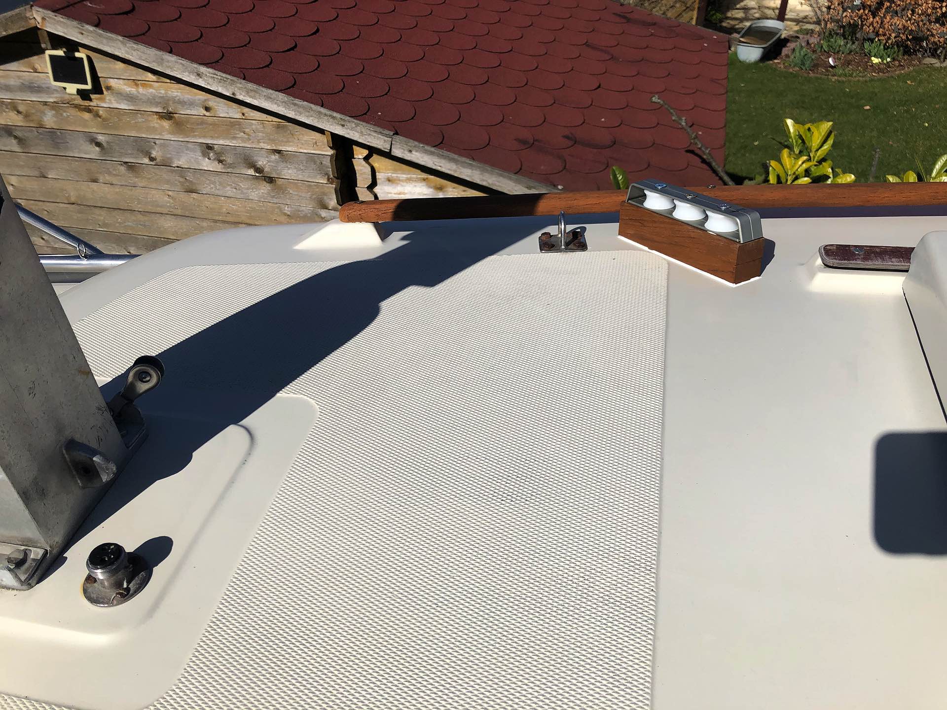 ich habe die Fallen ebenfalls seit dieser Saison umgelenkt. Zur Befestigung habe ich für die Innenseite jeweils eine Gegenplatte gerichtet. In die Rillen, welche zur Aussteifung der Deckeninnenschale dienen, habe ich genau in der Winkelung zugeschnittene Leisten verwendet. Diese schützen die Innenschale gegen Druck durch diese Gegenplatte an der Außenschale ab. Ausschneiden war also nicht erforderlich. Es wäre ja auch schade eine unbeschädigte Innenschale zu zerschneiden ... Dann habe ich die ganze Konstruktion einfach von außen durch geschraubt. Als Material habe ich solche Kunstoffplatten verwendet, wie sie z.B. für Wc Zwischenwände, Duschkabinen in Campingplätzen, Prallwänden usw. verwendet werden. Die sind extrem hart und wartungsfrei. Ich habe sie mir in einer Schreinerei aus der Restekiste besorgen können. Es gab sie da in 8 mm und 10 mm Stärke. Mit diesen Platten habe ich auch den Unterbau der Beschläge auf der Außenseite gemacht. Muss man nicht streichen und sieht akzeptabel aus. Die nötige Höhe, um die Fallen an der Decksschale reibungsfrei laufen lassen zu können, habe ich erreicht in dem ich 3 Platten mit 10 mm Stärke übereinander gelegt habe.