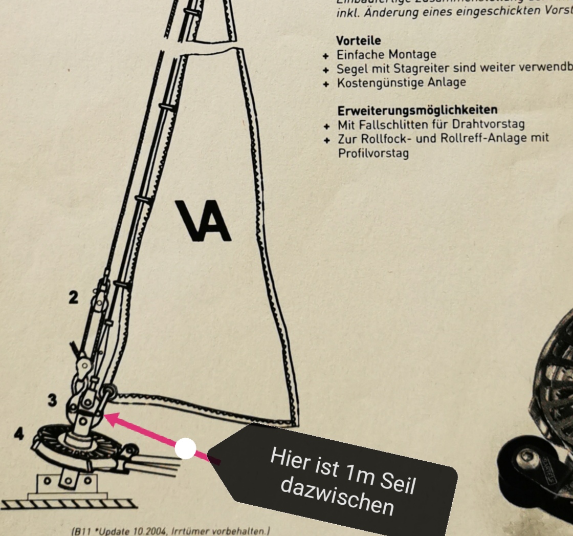 Aber mir fehlen ca 3 cm in der Länge des Vorstages, daher suche ich Möglichkeiten die Rolle runter zu bekommen.