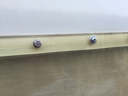 Als Besonderheit haben unsere Schrauben außen noch einen dünnen schwarzen Gummiring als zusätzliche Dichtung bekommen, damit auch kein Wasser zwischen Schraubenkopf und Fensterscheibe kriechen kann - und dann eventuell entlang der Schraube ins Innere kriechen kann... daher von innen auch noch einmal Gummiringe und Hutmuttern (wegen des Hinterkopfs) ;) .