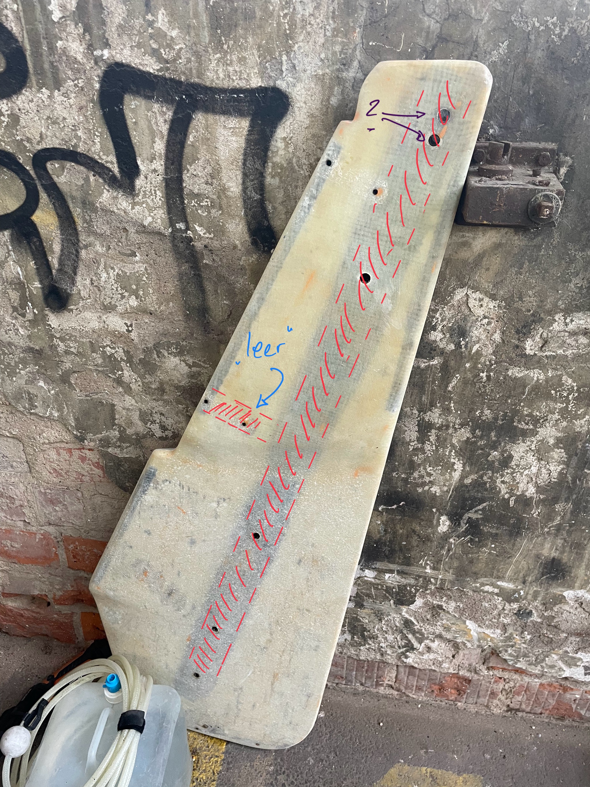 Ich bin tief beeindruckt von Walters Vorgehen, möchte aber eigentlich vermeiden, das Ruder komplett aufzutrennen. Daher habe ich überlegt, ob es nicht auch ein Vorgehen sein könnte, in das Ruder „Streifen“ zu schneiden, das morsche Holz rauszupopeln, neues Holz (oder 2K-Schaum?) rein, und wieder zulaminieren. Ich erhoffe mir davon, dass das Ruder so seine Form besser behält. Ich habe mal versucht, die Idee auf einem Foto zu verdeutlichen.