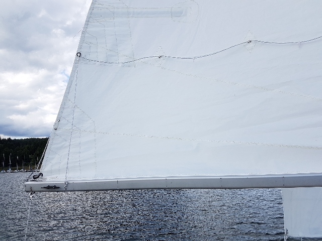 (Übrigens kann man durch die vordere Reffkausch einer kurzen Leine zieht und diese von beiden Seiten um den Mast führt und unter dem Lümmel verknoten. Solange genug Zug nach hinten möglich ist kann man das Segel so gut trimmen.)