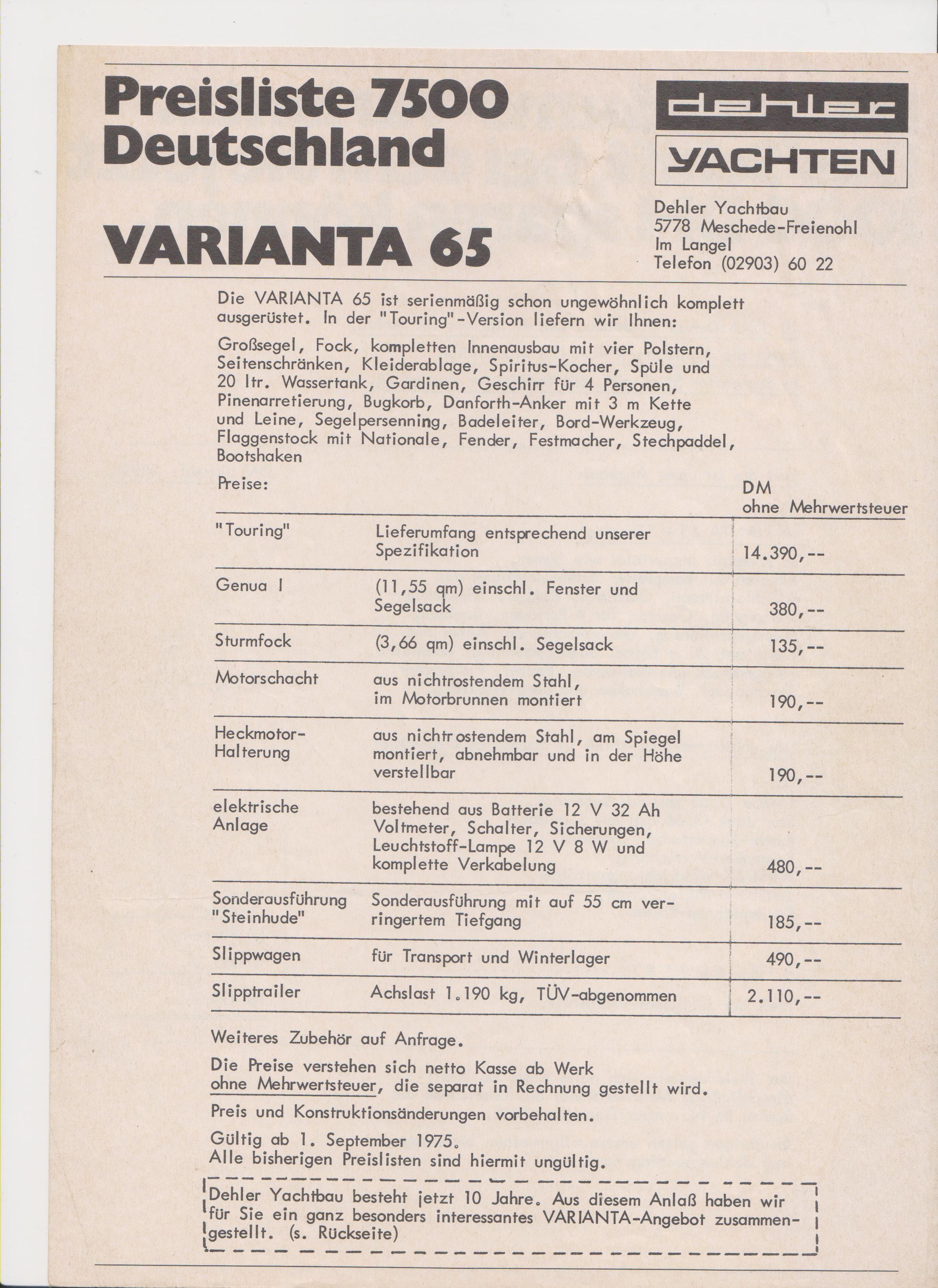 kann sich von Euch jemand an den Neupreis der Varianta 65 in den Jahren 1975 bis ca. 1981 erinnern? Bei den heutigen Neupreisen von 20 bis 22 Fuß Segelbooten erscheint eine Preisgestaltung für eine gebrauchte Varianta 65 sehr schwierig. Natürlich wird der Preis für ein gebrauchtes Boot immer abhängig sein, von dem Pflegezustand des Bootes insgesamt. Aber ein gewisser Preisverfall bei Gebrauchtbooten für die Innovationen und verbesserten Segeleigenschaften bei heutigen neuen Segelbooten, muss sicherlich auch berücksichtigt werden.