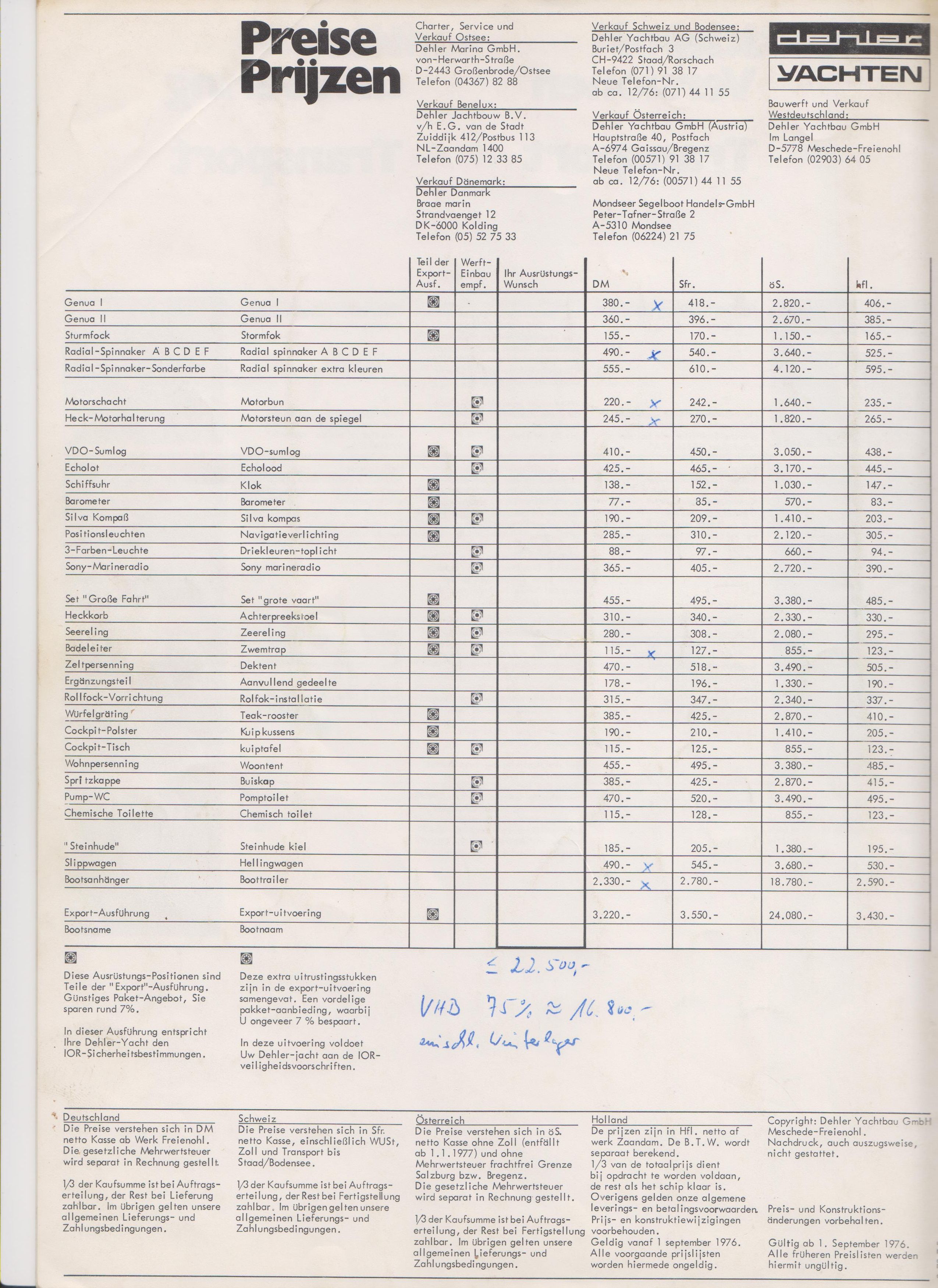Hallo, der Grundpreis ab Werft soll 1975 bei 15.000,-DM gelegen haben. Was da alles drin war (Trailer?), wird nicht angegeben.