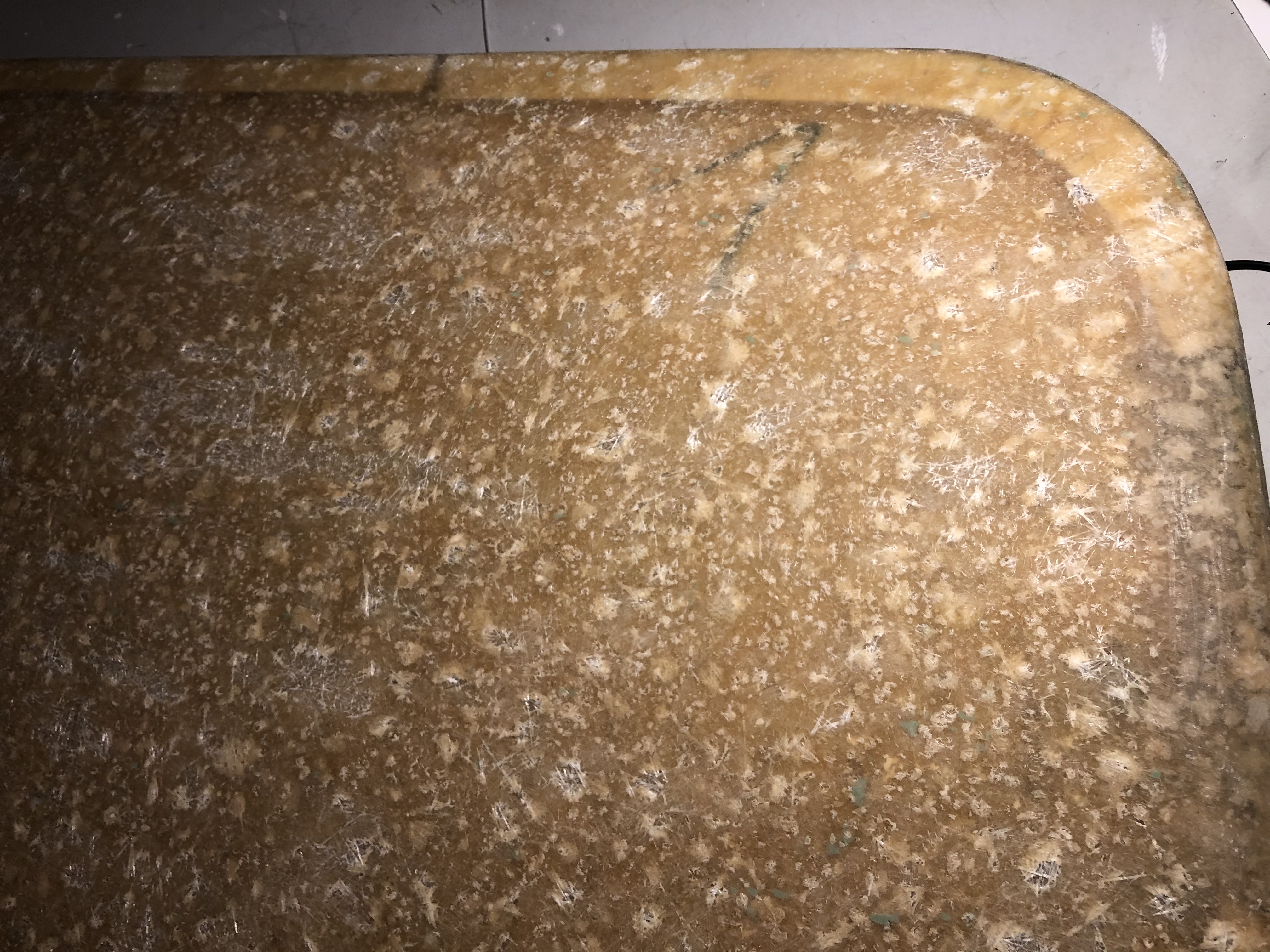 Einige Blasen wurden dabei aufgeschliffen, viele sind noch als helle Stellen sichtbar. Drückt man hier mit einer Nagelspitze drauf bzw. rein, kommt zwar keine Flüssigkeit mehr heraus, aber das Material ist geschwächt. Es knirscht. Da scheint fast nur noch Gewebe vorhanden zu sein. Die dunklen Stellen sind hingegen stabil.