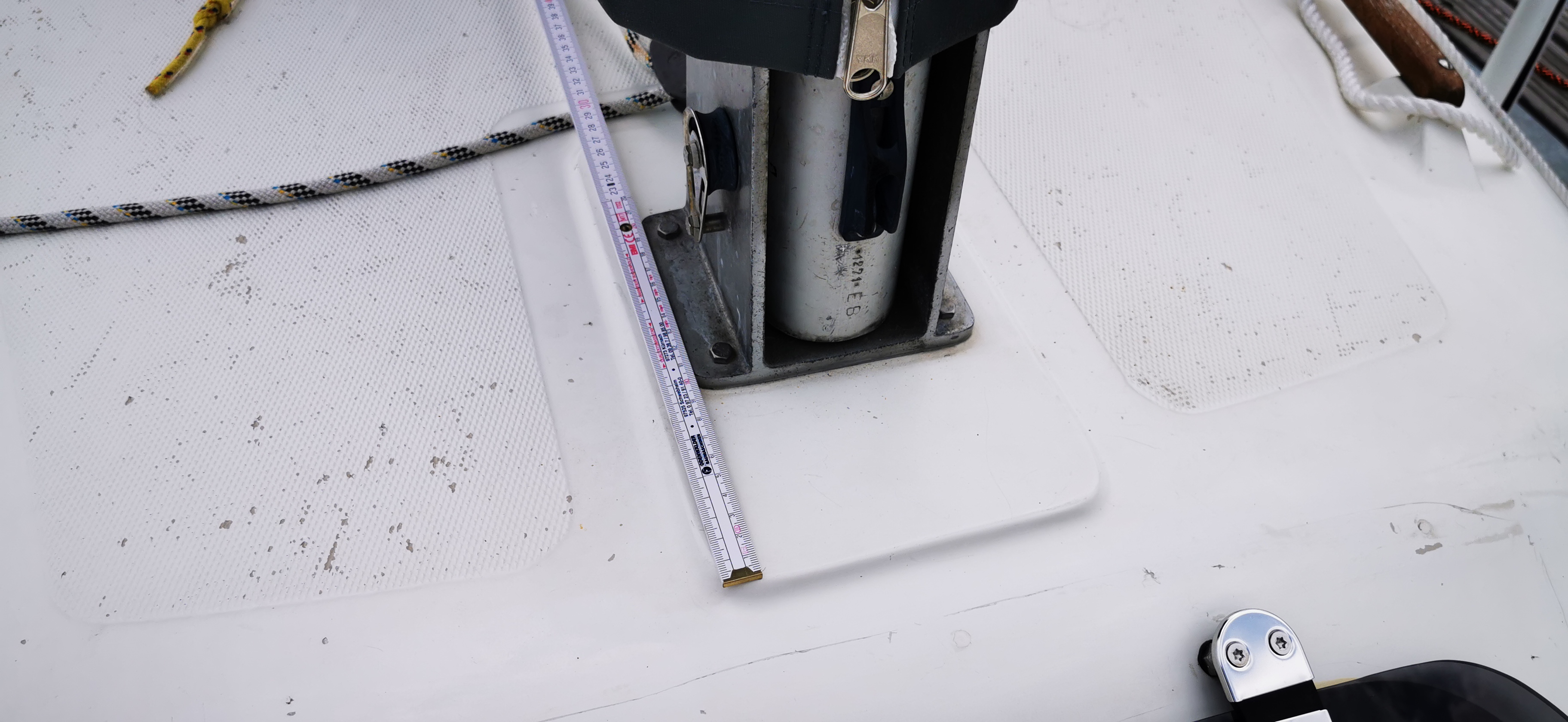 Ich bin ein wenig geplättet. Das ist also ein kleines Sandwich im Bereich des Mastfußes und wenn dort Feuchtigkeit eingedrungen sein sollte, ist eine Kernsanierung fällig wie in den Videos gezeigt. Das einzig Positive ist, dass der Sandwich-Bereich deutlich kleiner ist als in dem Fall, der in den Videos gezeigt ist.