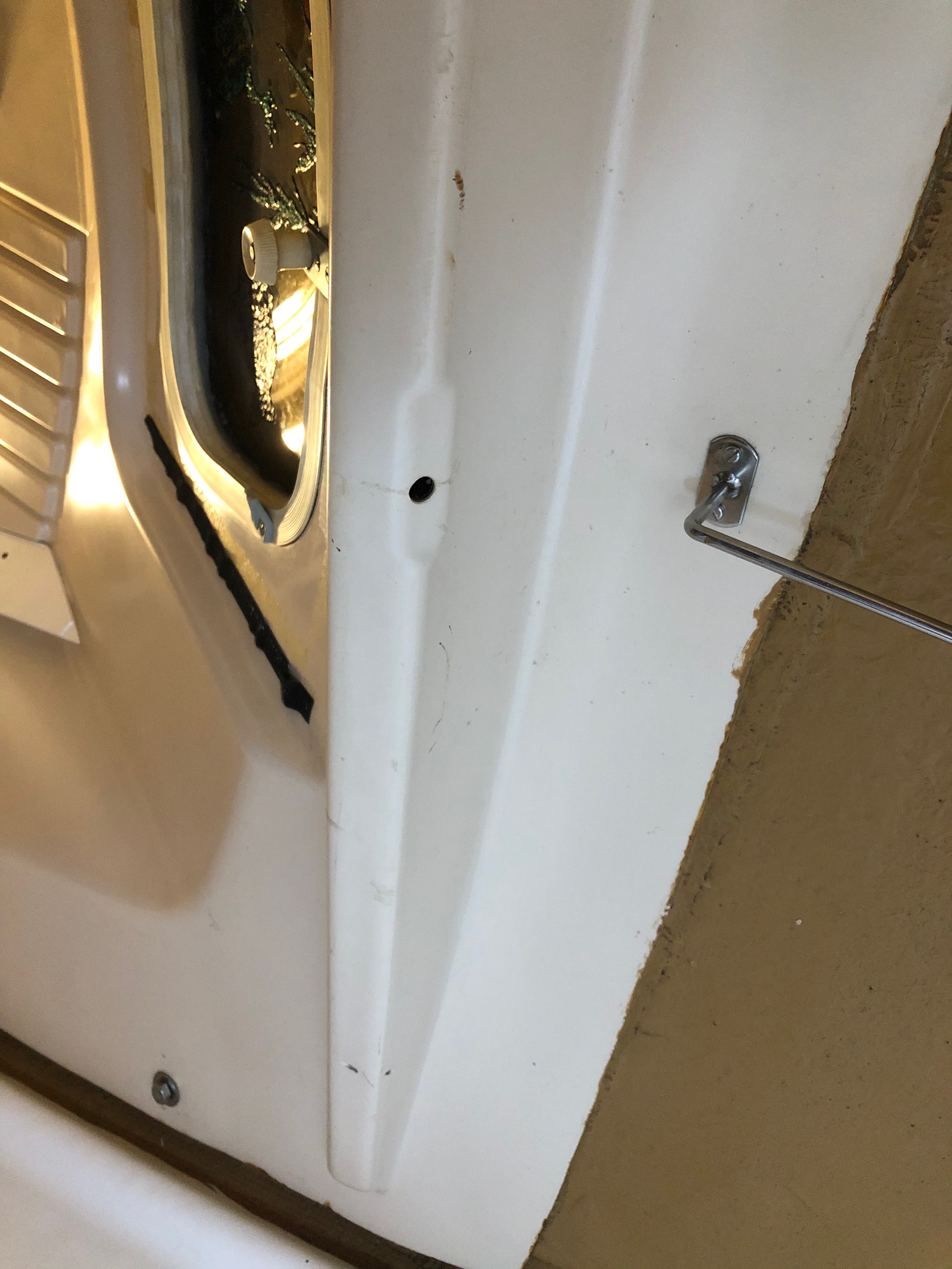 Nachdem die gebraucht gekaufte Kleiderklappe montiert war, stellte sich heraus, dass der Abstand zum Loch in der Innenschale doch etwas zu groß für einen Riegel ist (ca. 4 cm). Es sei denn, man baut einen entsprechend großen Riegel ein, aber müsste dafür dann wieder das Loch vergrößern...