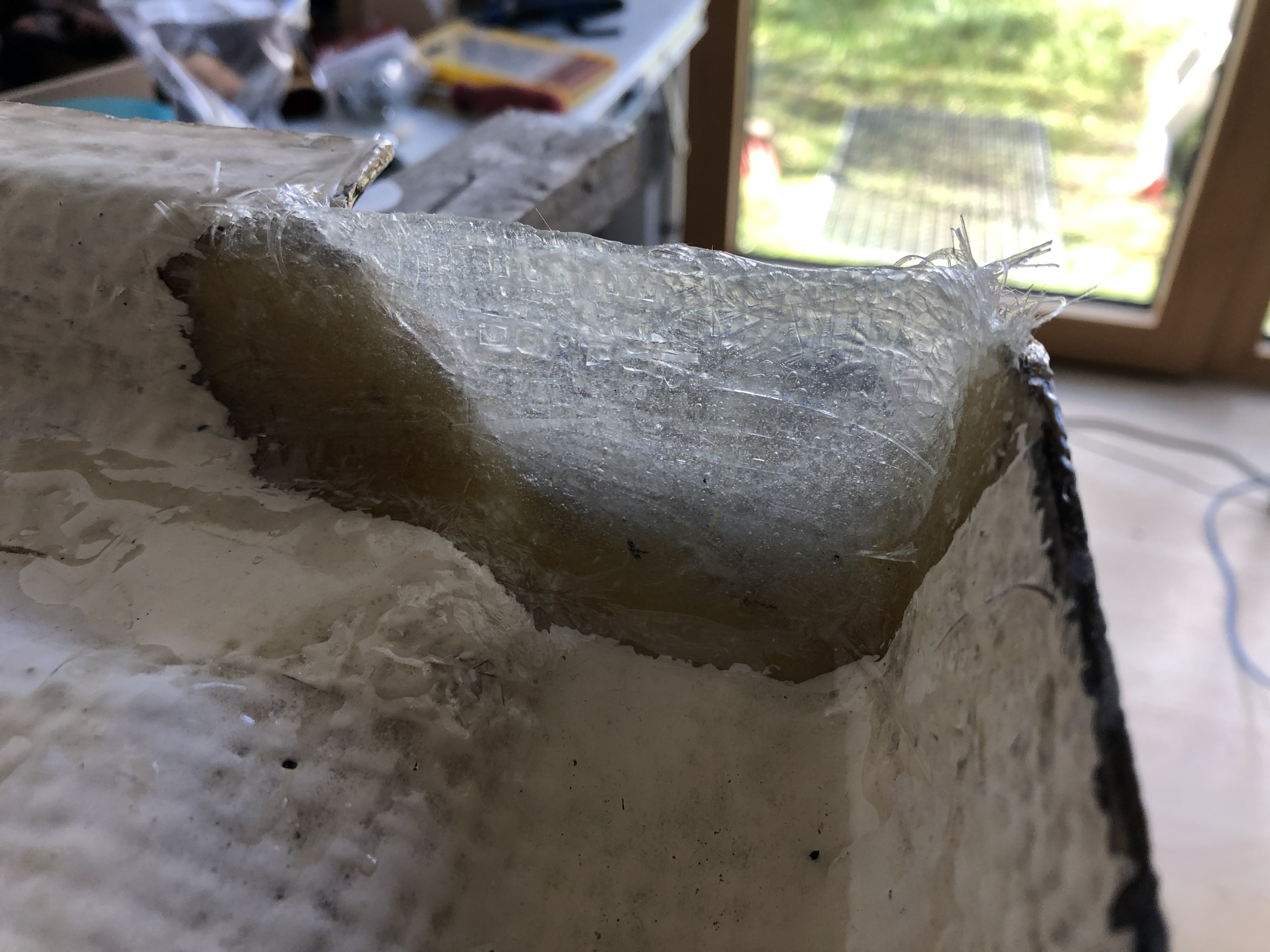 250g flüssigen Binder+Härter, teilweise ausgehärtet, zusammen mit Glasmatten wieder herauskratzen. Sauerei hoch 10