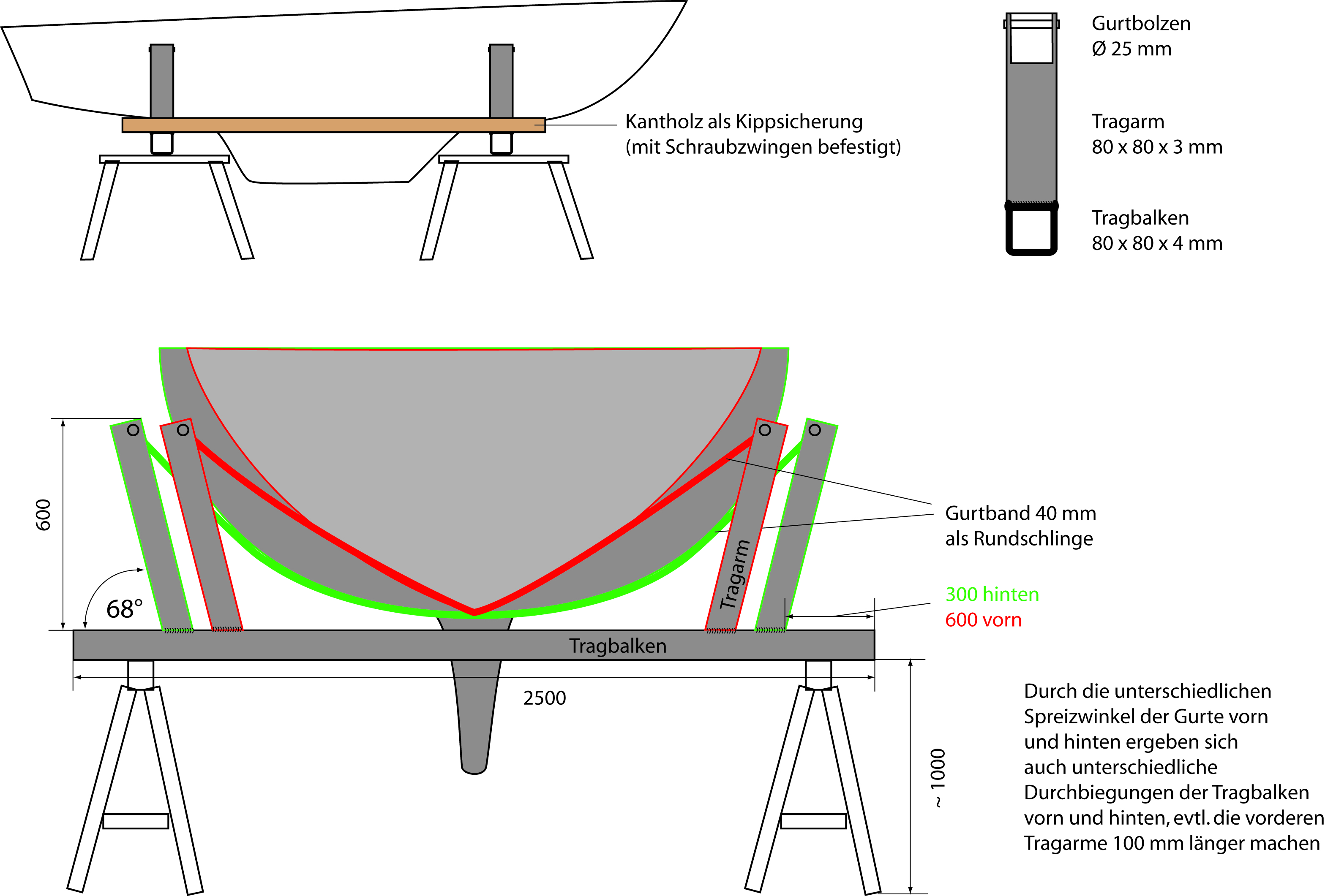 meine Version des Aufbockens. Da ich eher vorsichtig bin, geht mein "Aufbocken" so: Mit vier Kfz-Unterstellböcken und zwei Scherenwagenhebern (parallel links und rechts) an Vorder- und Hinterachse abwechselnd den Slipwagen soweit anheben, bis ich die Tragkonstruktion (siehe Grafik) auf 4 einmetrige Böcke setzen kann. Zur Kippsicherung ein Kantholz längs zum Rumpf auf die Tragbalken mit Schraubzwingen befestigt. Gurte einhängen, Slipwagen absenken und wegfahren. Die Rumpfflächen, die die Gurte abdecken, behandle ich, wenn das Boot wieder auf dem Slipwagen steht.